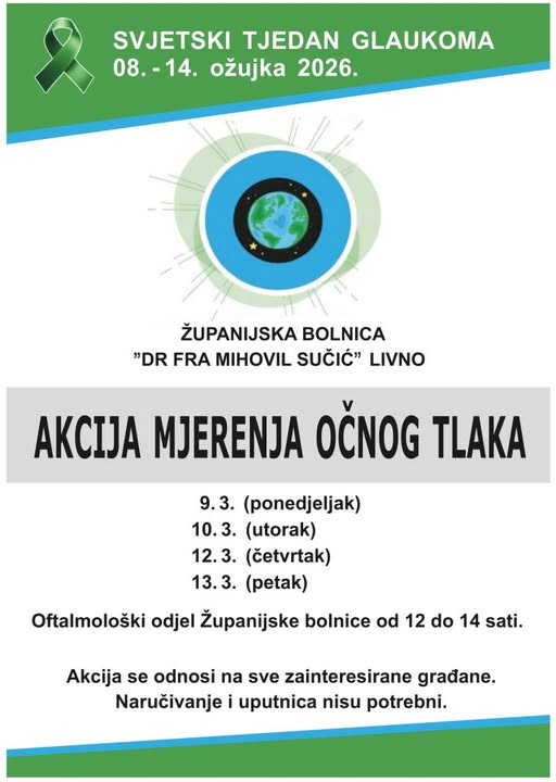 Povodom obilježavanja Svjetskog tjedna glaukoma, koji se ove godine obilježava od 8. do 14. ožujka, Oftalmološki odjel Županijske bolnice „Dr. fra Mihovil Sučić“ Livno organizira akciju besplatnog mjerenja očnog tlaka za sve zainteresirane građane.