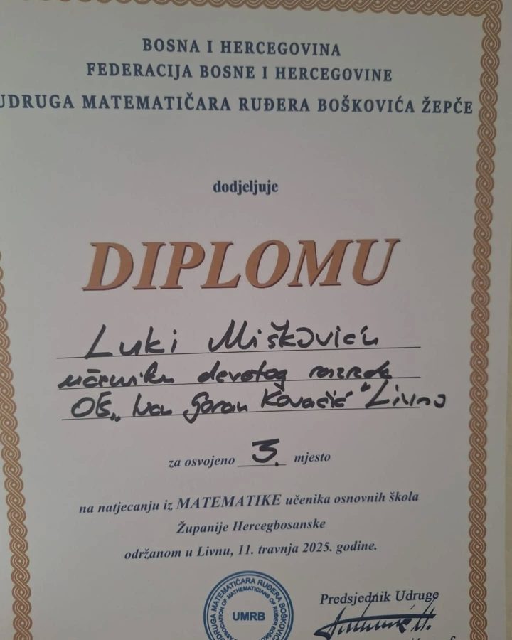 3. Luka Mišković (OŠ “Ivan Goran Kovačić”, Livno)