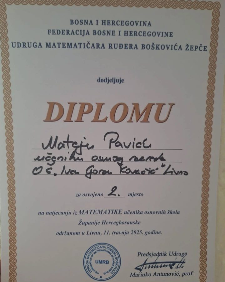 2. Matej Pavić (OŠ “Ivan Goran Kovačić”, Livno)