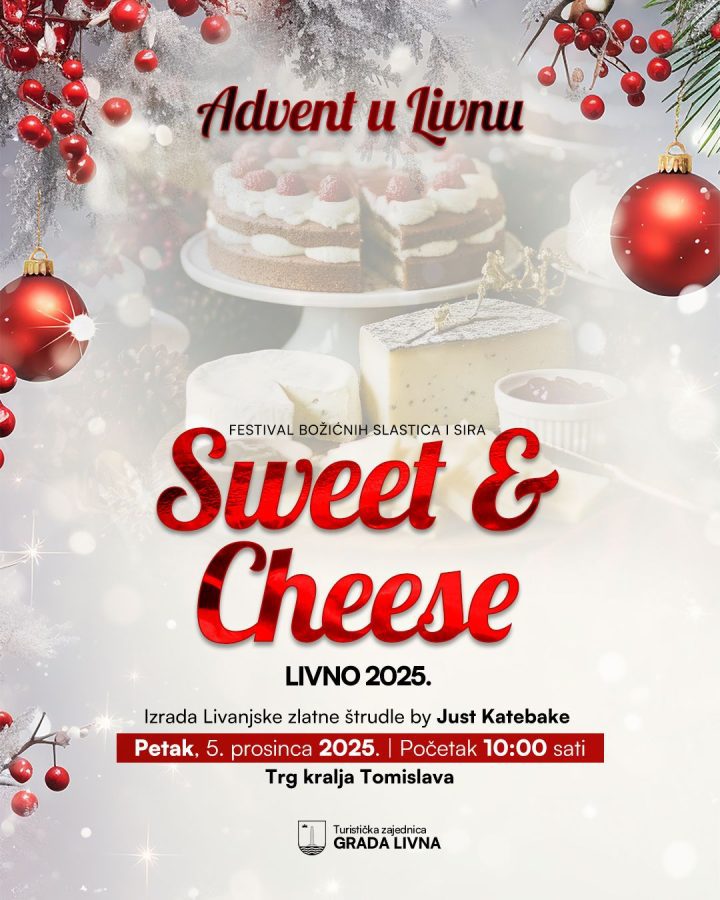 Turistička zajednica Grada Livna poziva sve slastičare, pekare, ugostitelje i zaljubljenike u slatko da sudjeluju na festivalu božićnih slastica “Sweet & Cheese”, koji će se održati u sklopu Adventa u Livnu 2025.