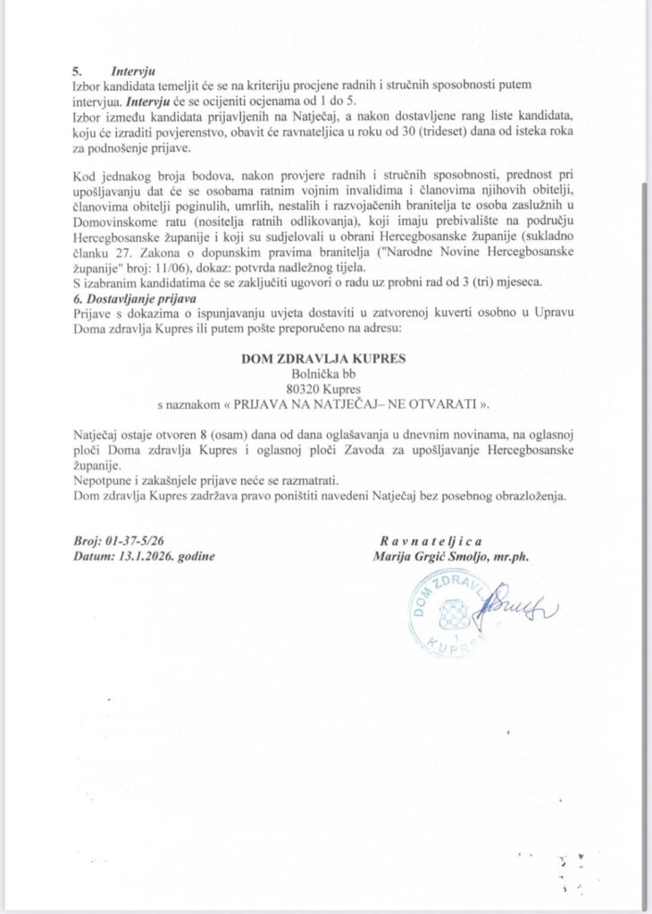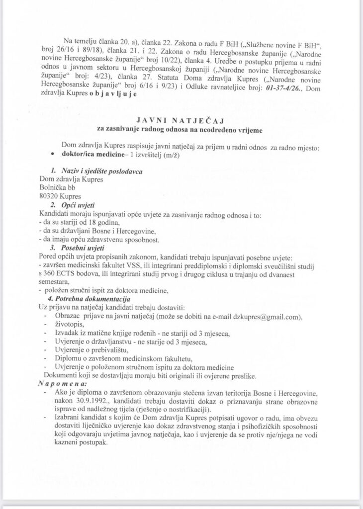 Javni natječaj za prijem u radni odnos za radno mjesto doktor/ica medicine, jedan izvršitelj. Liječniku se nudi stan na korištenje u blizini Doma zdravlja Kupres. Sve uvjete pogledajte na;