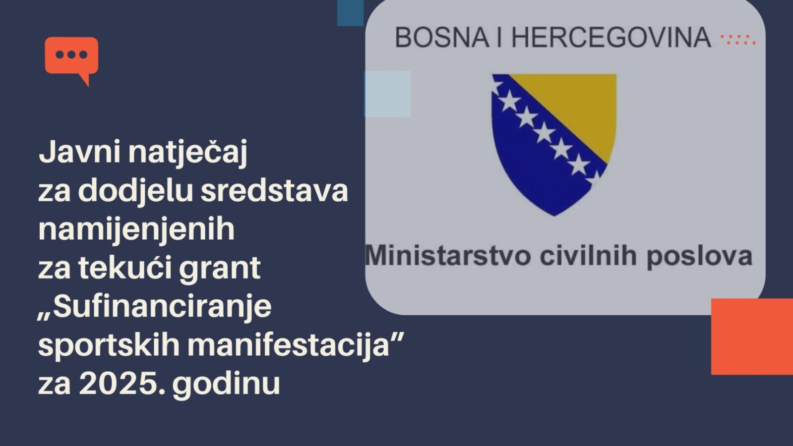Na temelju članka 9. Odluke o kriterijima za raspored sredstava namijenjenih za tekući grant „Sufinanciranje sportskih manifestacija” za radoblje 2024 – 2026 godinu („Službeni glasnik BiH“ broj 62/24) i člana 1. Odluke o izmjeni Odluke o kriterijima za raspored sredstava namijenjenih za tekući grant „Sufinansiranje sportskih manifestacija“ za razdoblje 2024 – 2026. godine broj VM: 156/25 od 21. 11. 2025. godine, Ministarstvo civilnih poslova Bosne i Hercegovine, objavljuje