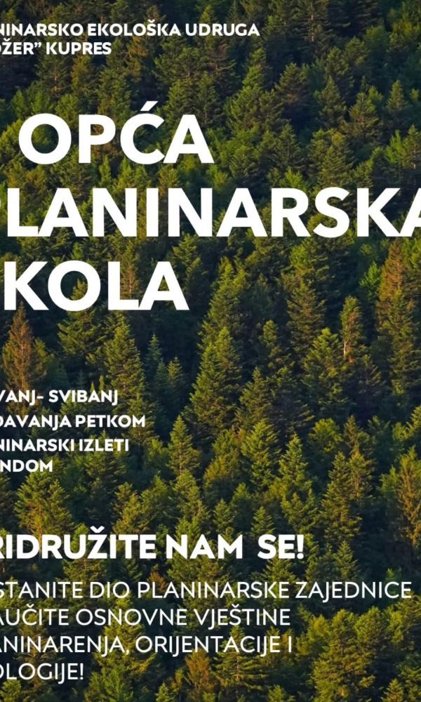Prva opća škola planinarenjaRedakcija12.03.2025Planinarsko ekološka udruga Stožer Kupres organizira prvu opću planinarsku školu, ... Pročitaj više