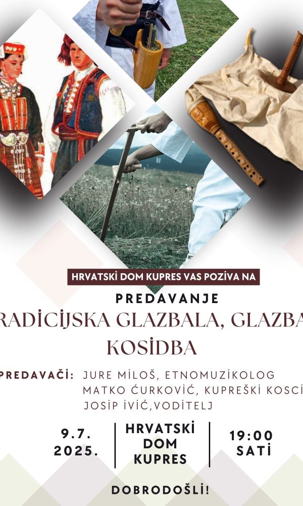 Predavanje o tradicijskoj glazbi i kosidbi u Hrvatskom domu KupresRedakcija02.07.2025Svi ljubitelji tradicije, glazbe i kulturne baštine pozvani su na ... Pročitaj više