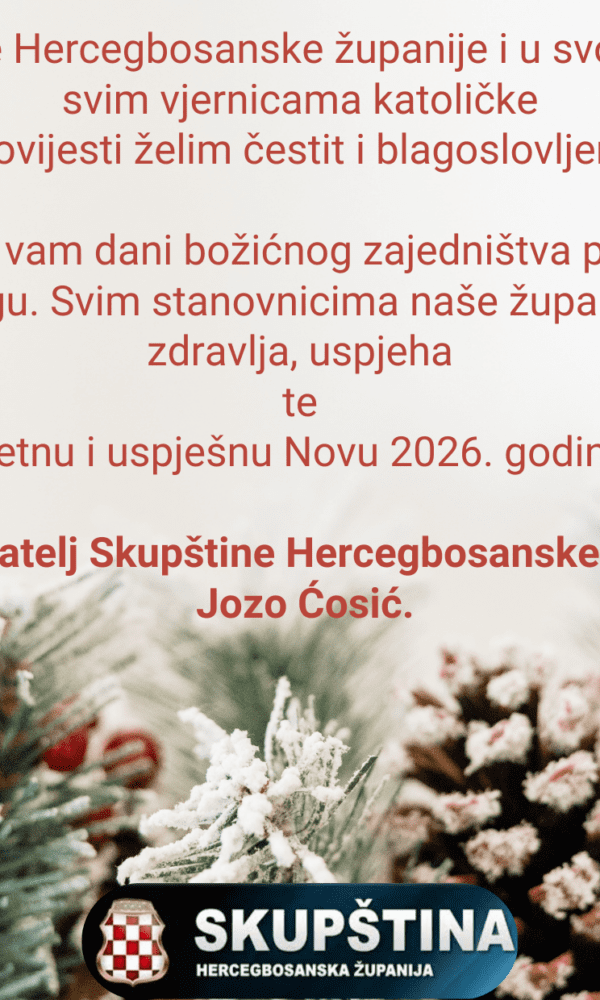 Božićna i novogodišnja čestitka predsjednika Vlade Hercegbosanske županijeRedakcija22.12.2025Poštovani žitelji Hercegbosanske županije, bliži nam se kraj još jedne ... Pročitaj više