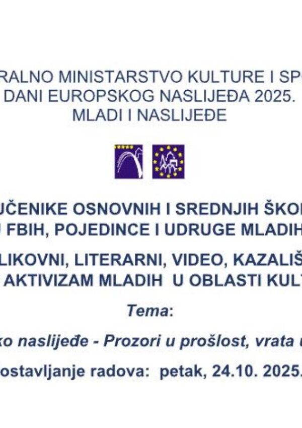 Natječaj za učenike, studente, pojedince i udruge mladih za najbolji rad: Mladi i naslijeđe 2025.Redakcija08.10.2025Federalno ministarstvo kulture i športa raspisalo je natječaj u okviru manifestacije Dani ... Pročitaj više