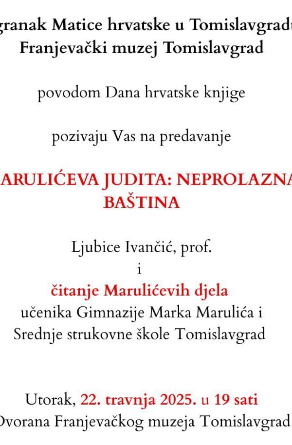 Predavanje; Marulićeva Judita: Neprolazna baštinaRedakcija21.04.2025Povodom Dana hrvatske knjige ogranak Matice hrvatske u Tomislavgradu vas ... Pročitaj više