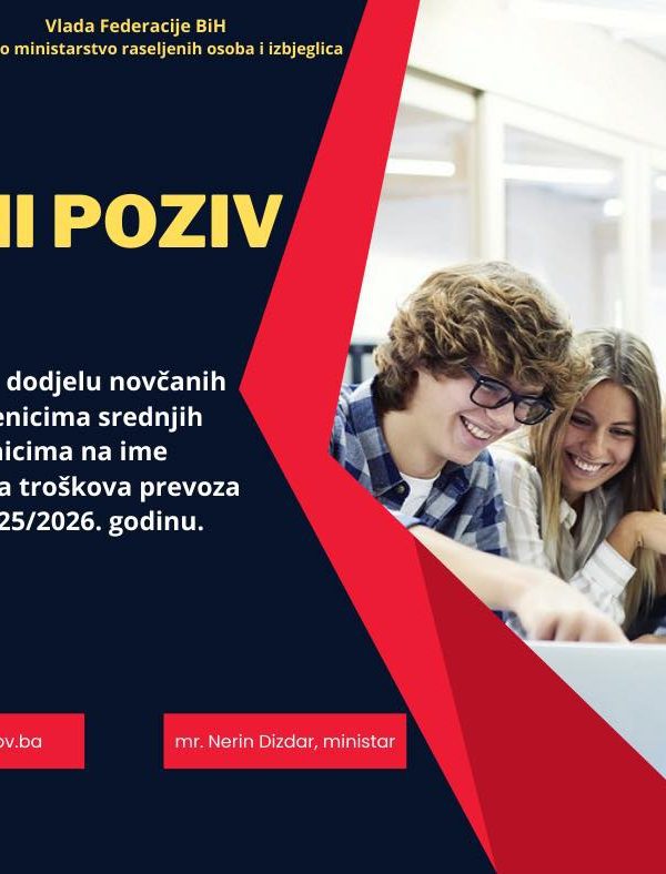 Tekst javnog poziva: https://fmroi.gov.ba/v3/wp-content/uploads/2025/09/Javni-poziv-za-dodjelu-novcanih-sredstava-ucenicima-srednjih-skola-povratnicima-na-ime-sufinansiranja-troskova-prevoza-za-skolsku-2025-2026-godinu.pdf https://fmroi.gov.ba/v3/wp-content/uploads/2025/09/OBRAZAC-PRIJAVE-NA-JAVNI-POZIV-PREVOZ-UCENIKA-2025-2026.pdf https://fmroi.gov.ba/v3/wp-content/uploads/2025/09/IZJAVA-POTVRDA-PREVOZ-UCENIKA-2025-2026.pdf Elektronsku prijavu obavite na ...