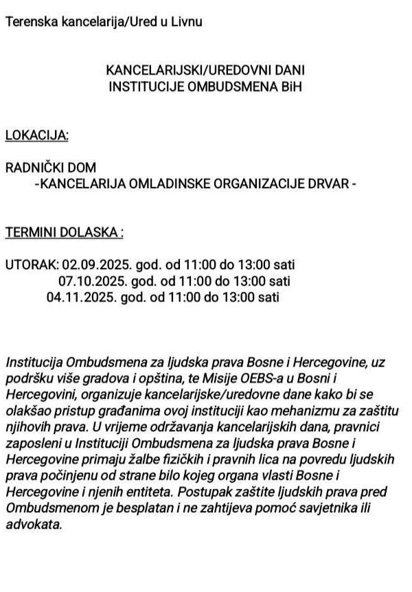 Uredovni dani institucije Ombudsmena za ljuska prava Bosne i Hercegovine u DrvaruRedakcija18.07.2025Obavještavamo građane da Institucija ombudsmena za ljudska prava Bosne i ... Pročitaj više