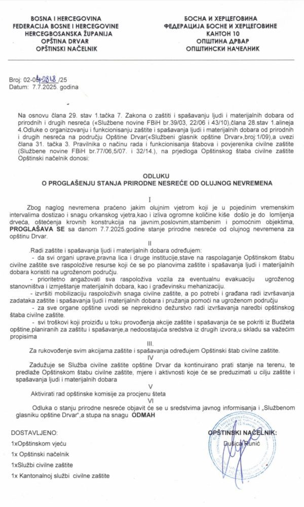 POZIV GRAĐANIMA OPĆINE DRVAR: Prijavite štetu nastalu uslijed olujnog nevremenaRedakcija10.07.2025Općina Drvar uputila je službeni poziv svim građanima da do ... Pročitaj više