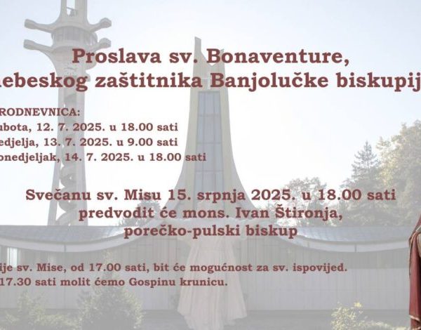 Proslava sv. Bonaventure – nebeskog zaštitnika Banjolučke biskupijeRedakcija11.07.2025Središnje Jubilejsko slavlje naše Biskupije proslavit ćemo na svetkovinu sv. ... Pročitaj više