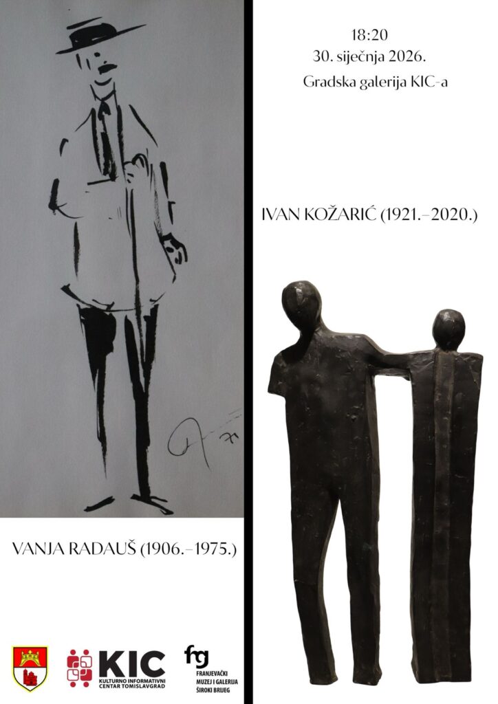 Vanja Radauš i Ivan Kožarić, dva snažna i osebujna umjetnika hrvatske moderne, susreću se na izložbi u Gradskoj galeriji KIC-a u Tomislavgradu. Njihova djela svjedoče o slobodi izraza, istraživanju forme i dubokom promišljanju čovjeka i prostora u kojem živi. Izložba se otvara 30. siječnja u 18:20 sati, u sklopu manifestacije Noći muzeja 2026. Posebna zanimljivost je VR animacija krunidbe kralja Tomislava na Duvanjskom polju, koja posjetiteljima nudi novo, suvremeno iskustvo umjetnosti. Pozivamo vas da nam se pridružite i doživite spoj tradicije i novih tehnologija.