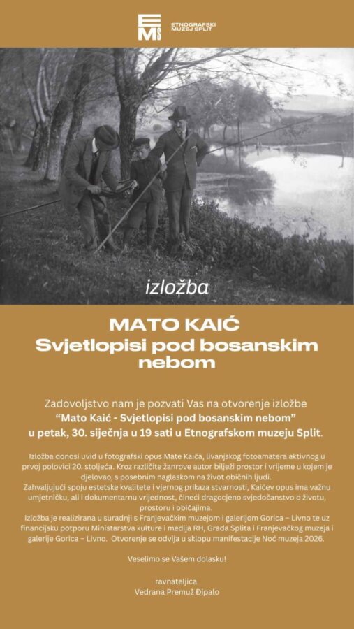 Franjevački muzej i galerija Gorica – Livno poziva sve Livnjake, prijatelje Livna i zaljubljenike u fotografiju da se pridruže otvorenju izložbe „Mato Kaić – svjetlopisi pod bosanskim nebom“, koje će se održati u petak, 30. siječnja 2026. godine, u 19 sati, u Etnografskom muzeju Split. Ulaz na izložbu je slobodan.
