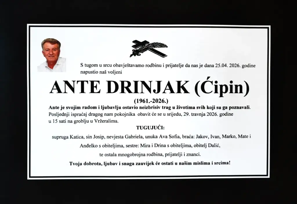 Preminuo je Ante Drinjak u 65-oj godini života. Pokop pokojnika će biti u srijedu 29. travnja 2026. godine u 15h na groblju u Vržeralima.