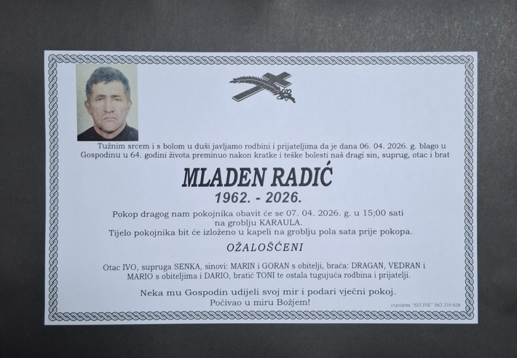Preminuo je Mladen Radić, u 64-oj godini života. Posljedni ispraćaj pokojnika bit će u utorak, 07. travnja. 2026. godine u 15:00h na groblju u Karaula.