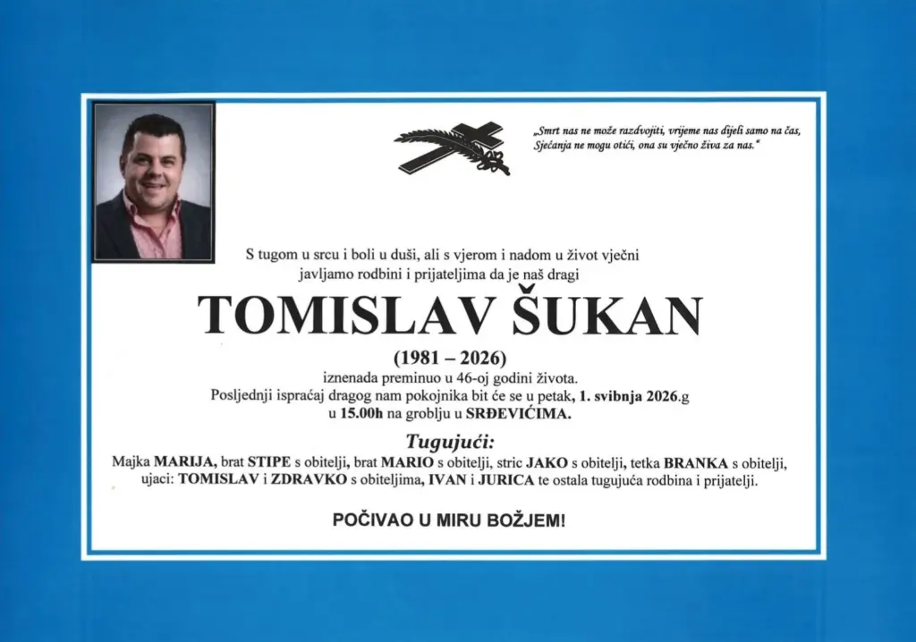 Preminuo je Tomislav Šukan u 46-oj godini života. Pokop pokojnika će biti u petak 1. svibnja 2026. godine u 15h na groblju u Srđevićima.
