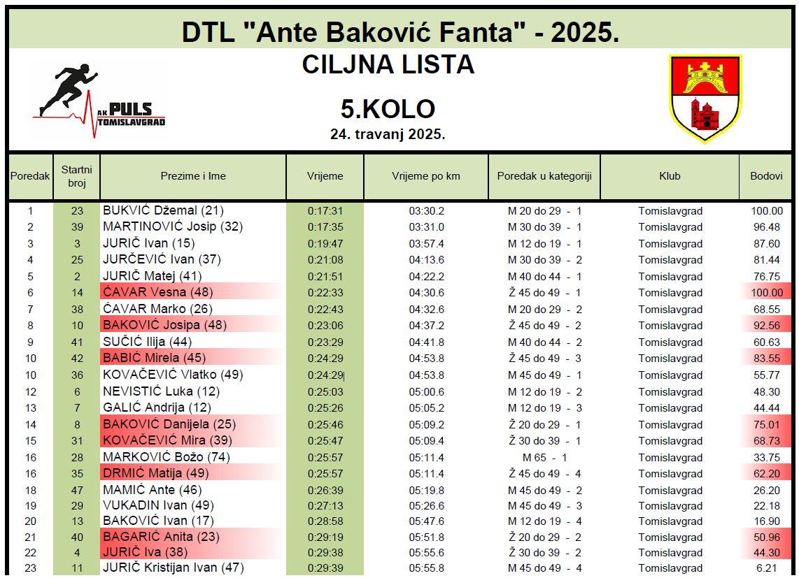 U odličnim vremenskim uvjetima i uz sjajnu atmosferu, održano je 5. kolo Duvanjske trkačke lige Ante Baković “Fanta”, sezona 2025. I ovoga puta na startu se okupio impresivan broj trkača i trkačica, a zajedništvo i natjecateljski duh ponovno su došli do izražaja.