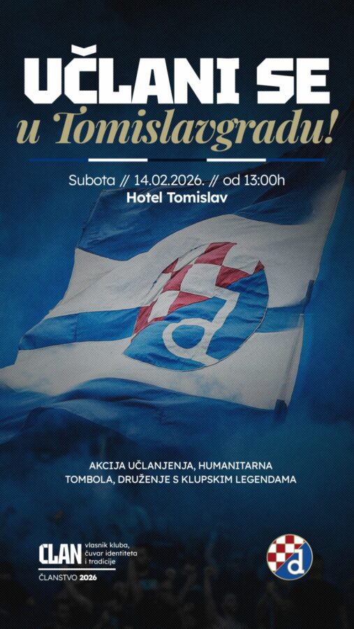 Klub navijača Dinama- Tomislavgrad organizira akciju učlanjena u Dinamo! Akcija će se održati 14.veljače.2026 u Hotelu Tomislav s početkom u 13:00H. Osim učlanjenja, možete se podružiti s klupskim legendama, a u sklopu akcije organizirana je i humanitarna tombola.