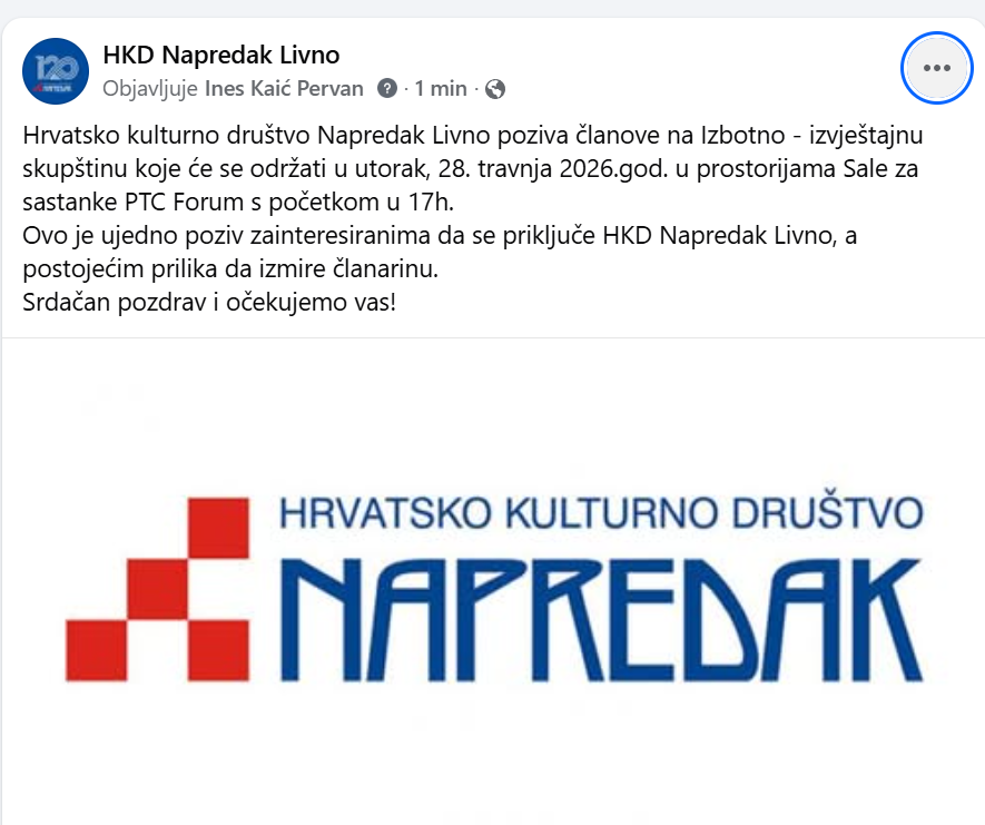 HKD “Napredak” Livno obavijestio je članstvo i zainteresiranu javnost održavanju izborno-izvještajne Skupštine u utorak, 28. travnja 2026. godine s početkom u 17h u PTC Forum. Ovo će ujedno biti i prilika za uključivanje u aktivan rad podružnice, kao i izmirenje članarine za postojeće članove.