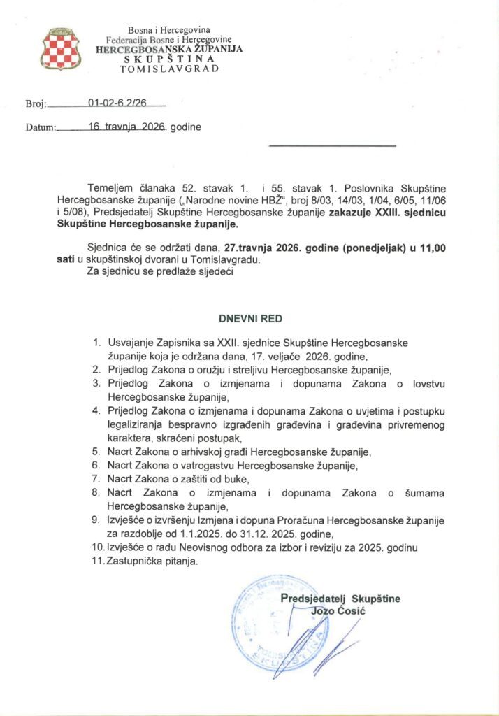 Zakazana je XXIII. sjednica Skupštine Hercegbosanske županije. Održat će se u Tomislavgradu 27. travnja 2026. godine (ponedjeljak) u skupštinskoj dvorani u 11:00 sati.