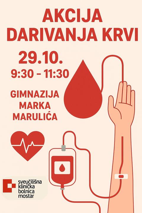 Crveni Križ Tomislavgrad u suradnji sa Transfuzijskim centrom SKB Mostar organizira dobrovoljno darivanje krvi pod nazivom “DARUJ KRV, SPASI ŽIVOT“. Akcija  darivanja krvi  održati će se  u srijedu 29. 10. 2025. godine u Gimnaziji Marka Marulića u razdoblju od 09:30-11:30h. Pozivamo sve koji su u mogućnosti da se odazovu dobrovoljnoj akciji darivanja krvi i s tim pomognu onima kojima je krv potrebna. Za sve darovatelje bit će osiguran zahvalni obrok.