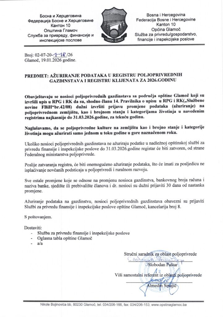 Ažuriranje podataka u Registru poljoprivrednih gazdinstava i Registru klijenata za 2026. godinu sa područja Općine Glamoč