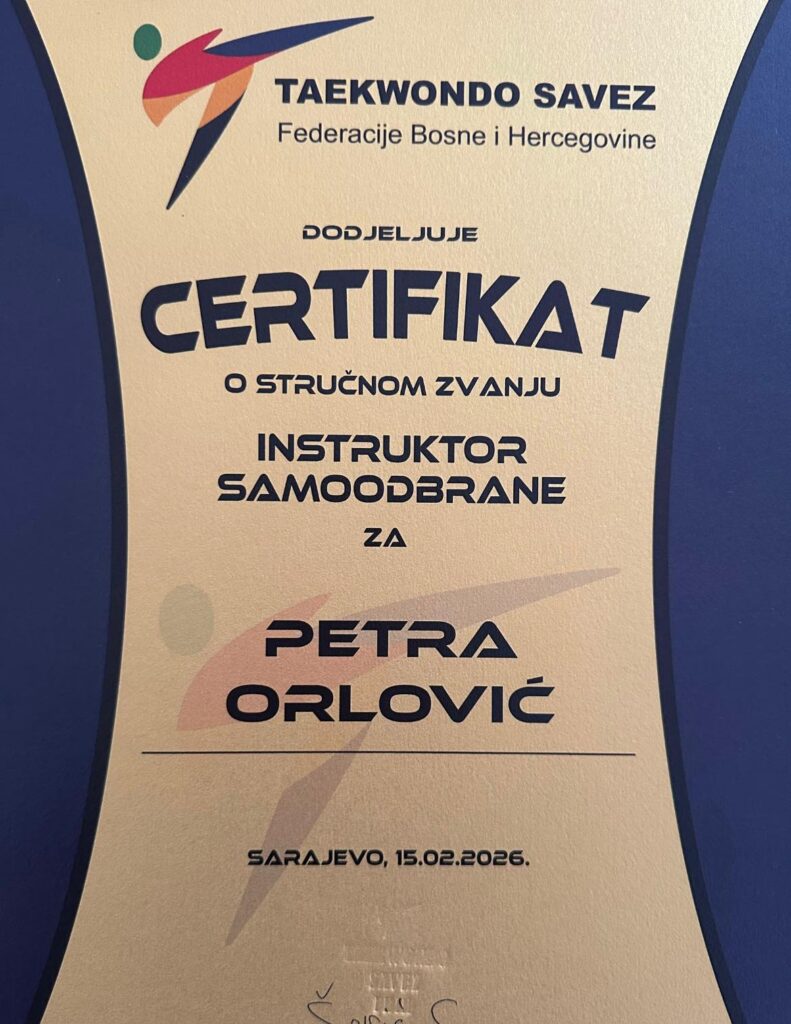 Veliko priznanje primila je i trenerica Petra Orlović, kojoj je uručen certifikat stručnog zvanja instruktorice samoodbrane. Orlović je sudjelovala u opsežnom projektu obuke i licenciranja instruktora za samoodbranu, kroz koji je osposobljeno ukupno 18 novih instruktora.
