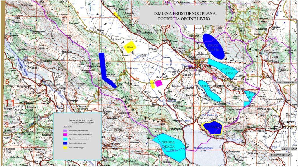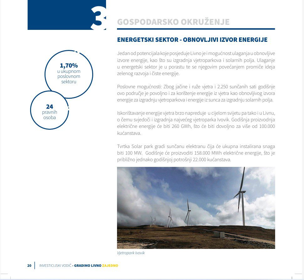 U nastavku donosimo preslike službenih dokumenata Grada Livna na kojima se promoviraju vjetroparkovi, uključujući i VE Ivovik za koji postoje ozbiljne optužbe na račun grada za otimanje privatne imovine, a također donosimo i presliku važećeg prostornog plana koji na Kruzima predviđa čak dva vjetroparka tik iznad grada.
