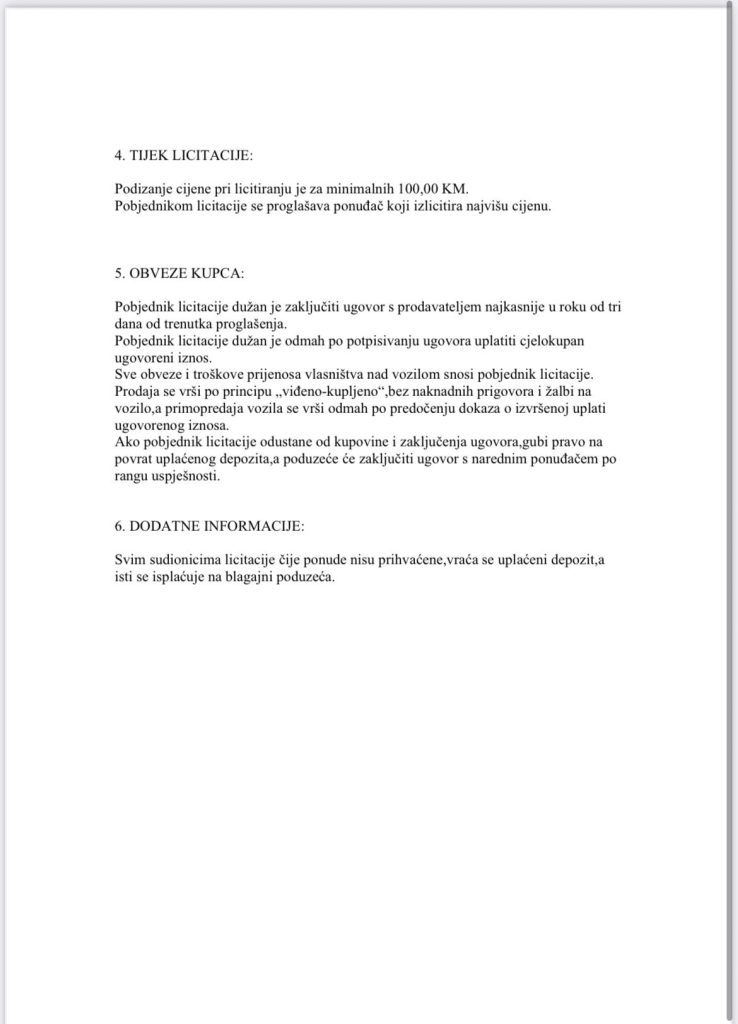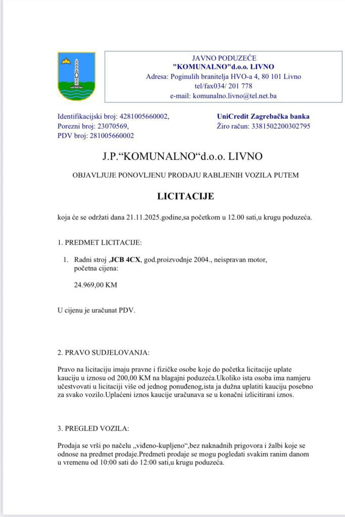 Javno poduzeće „Komunalno“ d.o.o. Livno objavilo je ponovljenu prodaju rabljenog vozila putem javne licitacije, koja će se održati 21. studenog 2025. godine s početkom u 12:00 sati u krugu poduzeća.