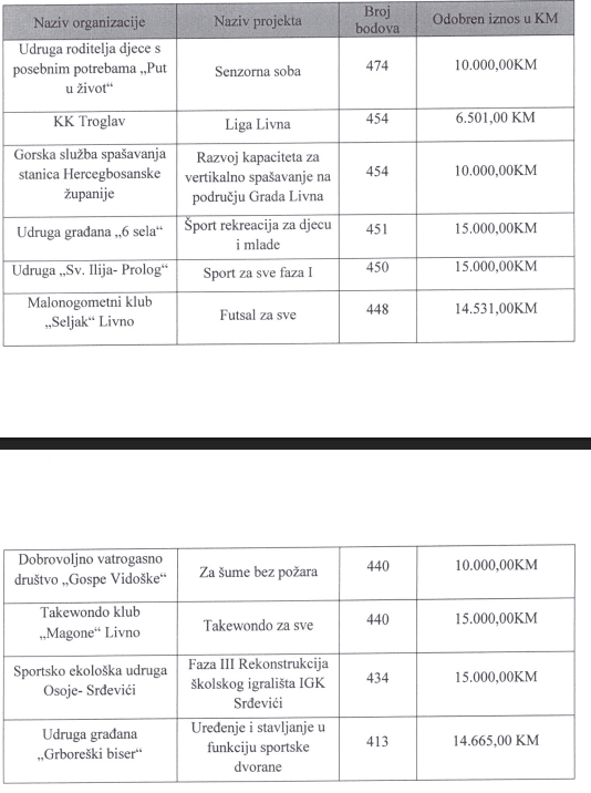 Zanimljivi su nazivi odabranih projekata. “Takewondo za sve”, sport za sve” i “futsal za sve” zvuče kao projekti pisani iz pera iste osobe. Postavlja se pitanje jesu li ova sredstva mogla biti upotrijebljena u korisnije svrhe, premda ne osporavamo niti opravdanost odabranih projekata. I samo bodovanje je zanimljivo. Tako su PUŽ, GSS HBŽ i DVD Vidoši dobili po 10.000 KM, a seoske udruge po 15.000 KM, premda ove tri udruge imaju nesumnjivo veći značaj za društvenu zajednicu.