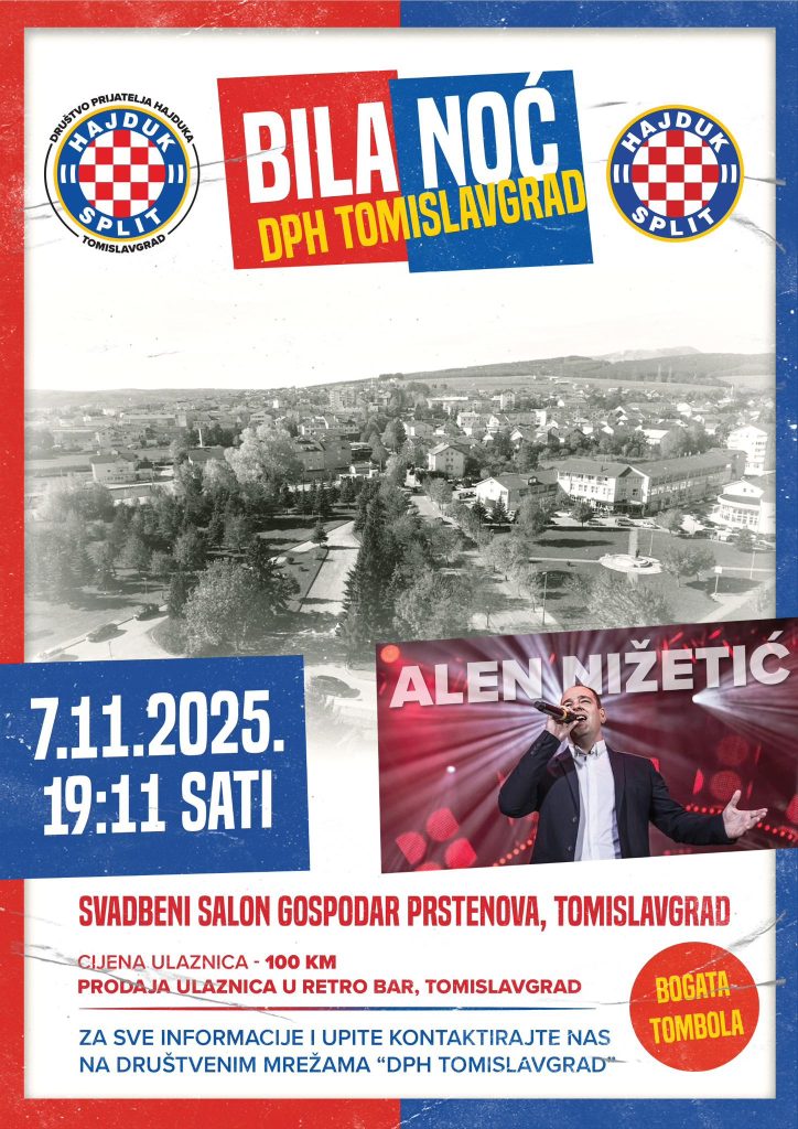 Društvo prijatelja Hajduka Tomislavgrad organizira BILU NOĆ u Tomislavgradu, koja će se održati 7. studenog 2025. godine u svadbenom salonu Gospodar prstenova s početkom u 19:11 sati. Za atmosferu će se pobrinuti Alen Nižetić i bend, a ulaznice po cijeni od 100 KM (uključena hrana piće i odlična zabava) mogu se nabaviti u Retro baru u Tomislavgradu. Sve posjetitelje očekuje i vrijedna tombola, a sav prihod od tombole bit će doniran za izgradnju senzornog igrališta za štićenike centra za odgoj i obrazovanje djece i mladeži s poteškoćama u razvoju “Nova Nada” Tomislavgrad.