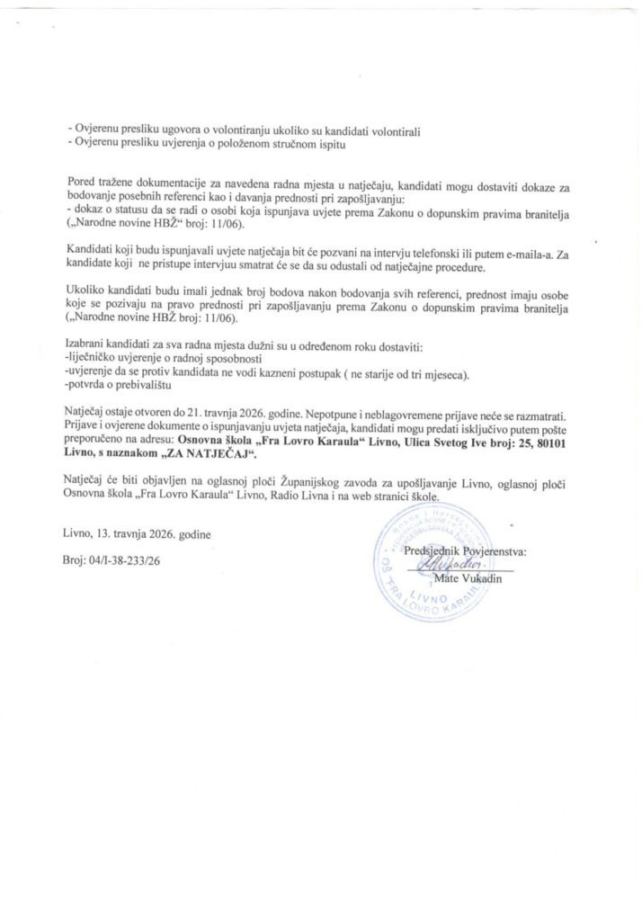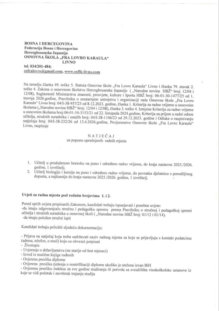 Osnovna škola Fra Lovro Karaula Livno objavila je natječaj za popunu radnih mjesta, a riječ je o dvije pozicije na određeno vrijeme do kraja nastavne 2025./2026. godine.