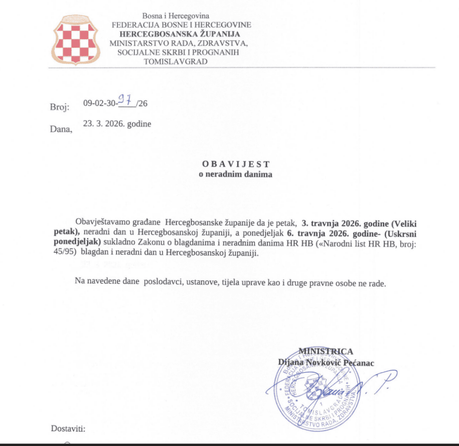 Ministarstvo rada, zdravstva, socijalne skrbi i prognanih Hercegbosanske županije obavještava građane da je petak 3. travnja 2026. godine (Veliki petak) neradni dan u Hercegbosanskoj županiji, a ponedjeljak 6. travnja 2026. godine (Uskrsni ponedjeljak), sukladno Zakonu o blagdanima i neradnim danima HR HB («Narodni list HR HB, broj 45/95), blagdan i neradni dan u Hercegbosanskoj županiji.