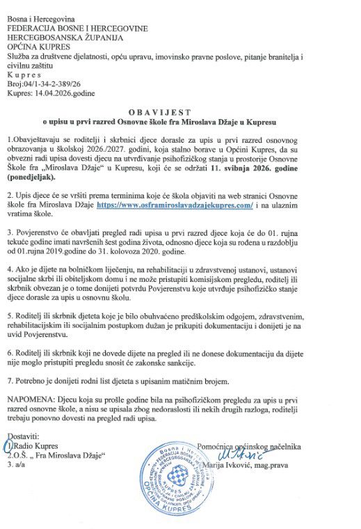 Obavijest o upisu u prvi razred Osnovne škole fra Miroslava Džaje u Kupresu