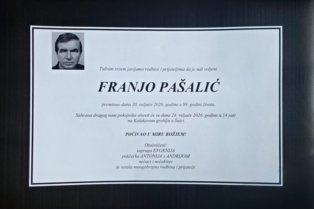 Preminuo je Franjo Pašalić. Sprovod je na Kolakovom groblju 24.veljače.2026 godine u 14 sati.