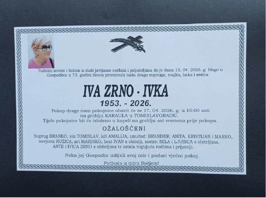 Preminula je Iva Zrno-Ivka, u 73. godini života. Tijelo pokojnice bit će izloženo u kapeli na groblju sat vremena prje pokopa. Pokop pokojnice obavit će se 17.travnja. 2026. godine.