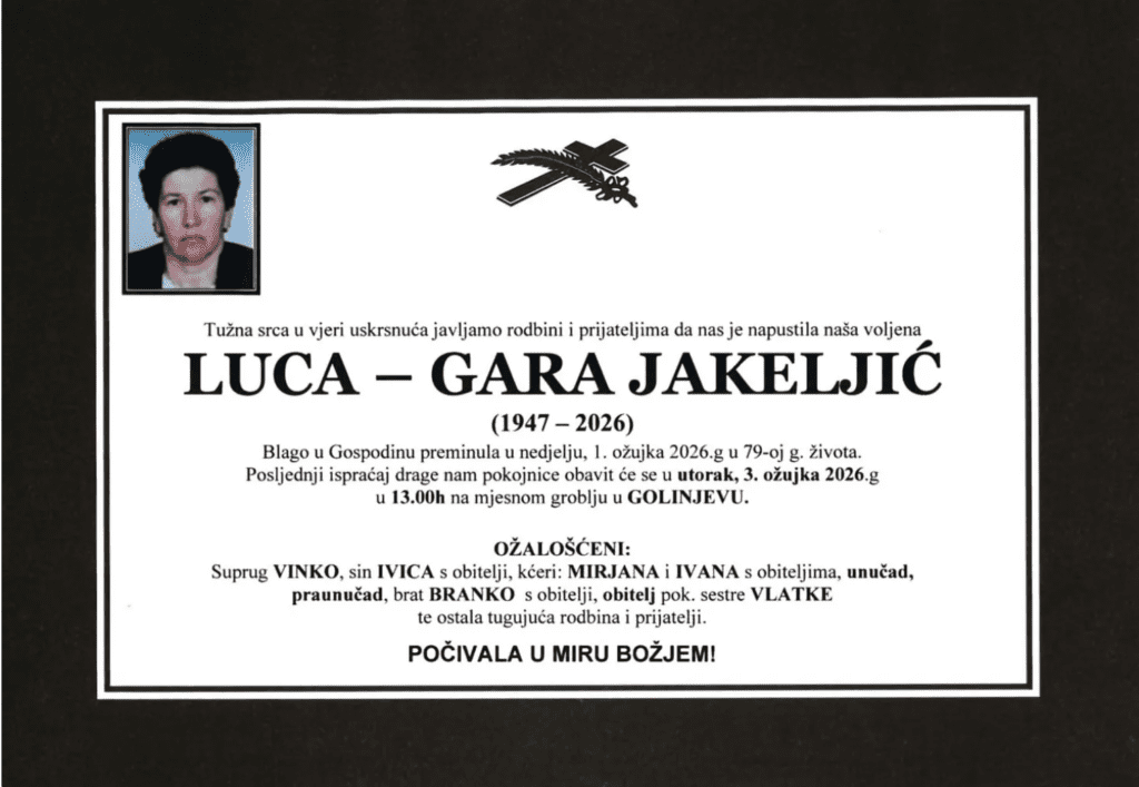 Preminula je Luca-Gara Jakeljić u 79–toj godini života. Sprovod će biti u utorak 3.ožujka. 2026. godine u 13h na mjesnom groblju u Golinjevu.