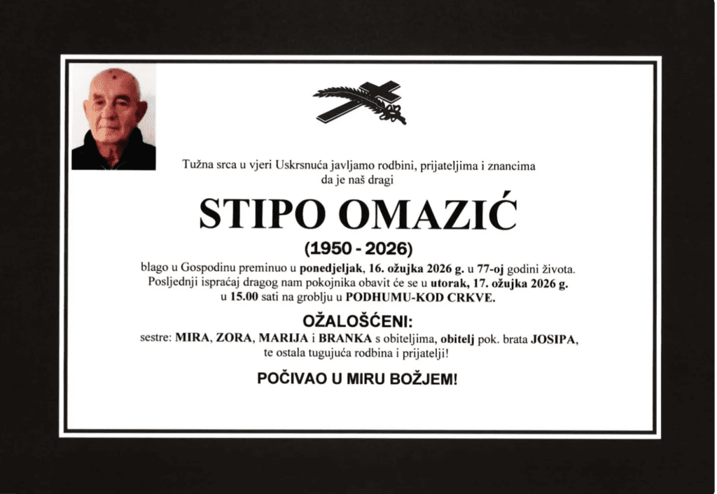 Preminuo je Stipo Omazić u 77-oj godini života. Posljednji ispraćaj će biti u utorak, 17. ožujka 2026. godine na groblju u Podhumu- kod Crkve.