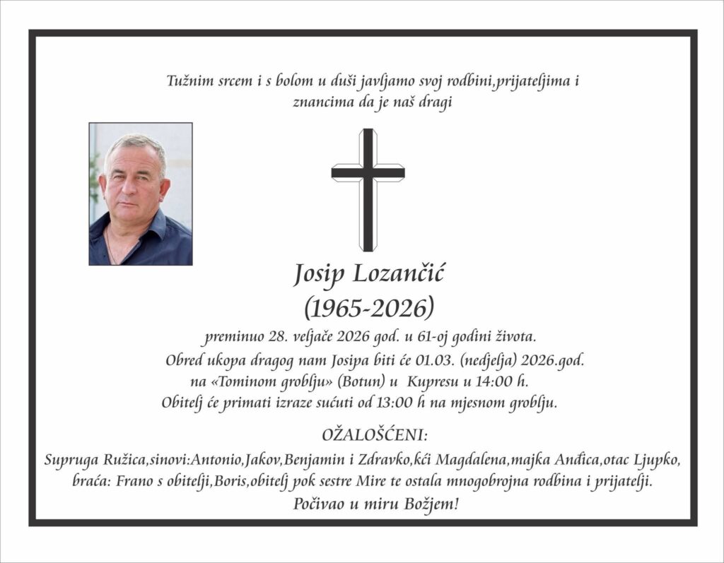 Preminuo je Josip Lozančić, u 61.godini života. Sprovod je u nedjelju, 1. ožujka 2026. godine u 14 sati na Tominom groblju u Kupresu.