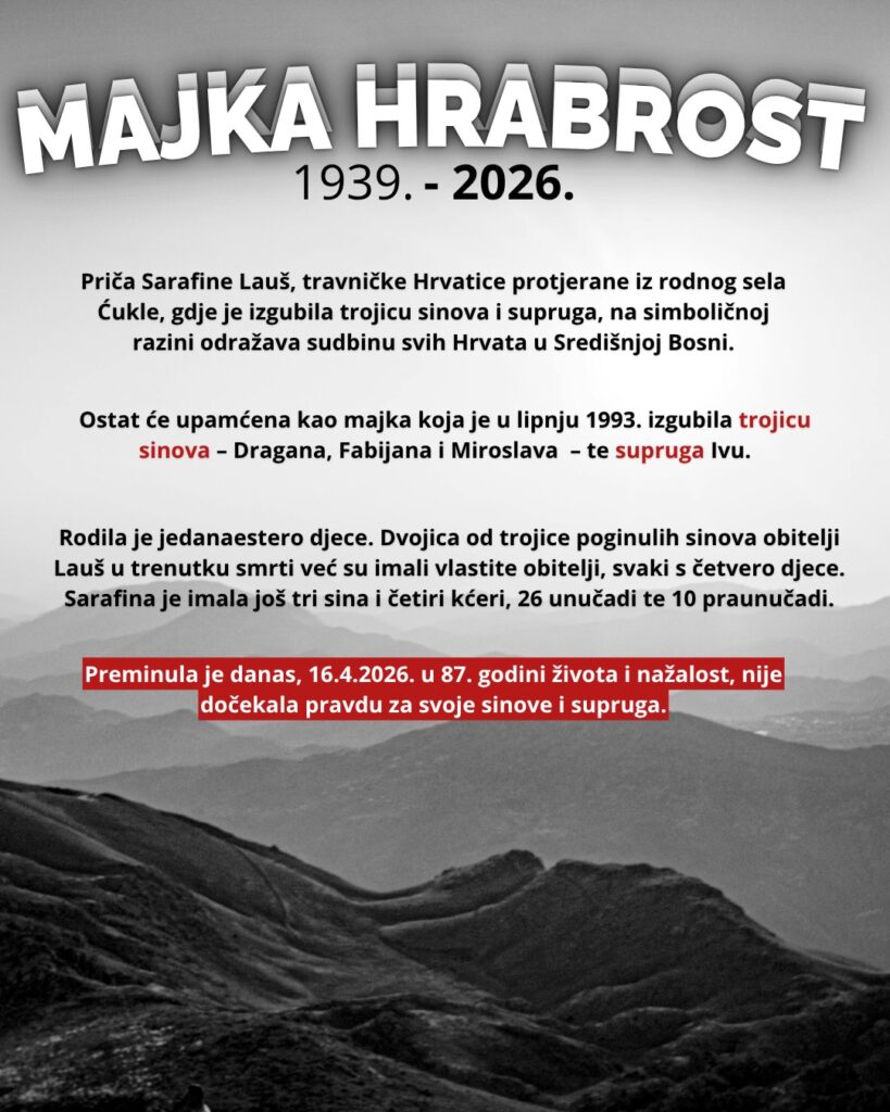 Sarafina Lauš nije bila samo ime – bila je simbol snage, boli i dostojanstva. Priča Sarafine Lauš, travničke Hrvatice protjerane iz rodnog sela Ćukle, gdje je izgubila trojicu sinova i supruga, na simboličnoj razini odražava sudbinu svih Hrvata u Središnjoj Bosni. Ostat će upamćena kao majka koja je u lipnju 1993. izgubila trojicu sinova- Dragana, Fabijana i Miroslava te supruga Ivu. Rodila je 11 djece. dvojica od trojice poginulih sinova obitelji Lauš u trenutku smrti već su imali vlastite obitelji, svaki s četvero djece. Sarafina je imala još tri sina i četiri kćeri, 26 unučadi te 10 praunučadi.