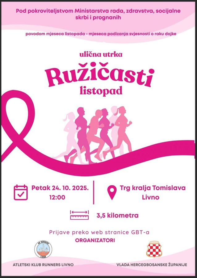 U sklopu kampanje „Ružičasti listopad“, koju provodi Ministarstvo rada, zdravstva, socijalne skrbi i prognanih Hercegbosanske županije, u petak, 24. listopada 2025. godine, u Livnu će se održati ulična utrka „Ružičasti listopad“. Manifestacija će započeti u 12 sati na Trgu kralja Tomislava.