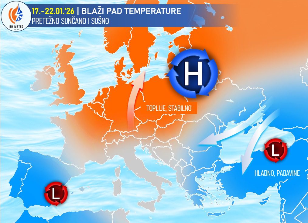 U periodu od danas, 17. siječnja, do sredine idućeg tjedna, Bosnu i Hercegovinu očekuje uglavnom stabilno vrijeme. Prevladavat će sunčani intervali, dok će se u jutarnjim satima po kotlinama i uz riječne tokove često javljati magla i niska naoblaka, koja će se tijekom dana u većini krajeva postupno dizati.