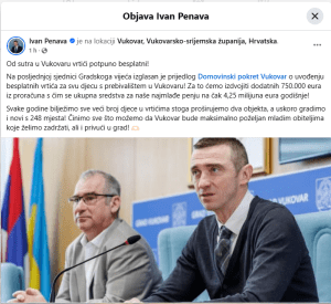 Paralelno s informacijama koje dobivamo o poskupljenju vrtića u Livnu, došli smo do objave Ivana Penave, gradonačelnika Vukovara. Vukovar od 1. ožujka uvodi besplatan vrtić za svu djecu za što izdvaja dodatnih 750 000 € iz svoga Proračuna, čime se ukupna suma predviđena za vrtiće na području ovog Grada penju na čak 4,25 milijuna €. Tako se vodi računa o najmlađima i obnovi demografske slike svoga grada!
