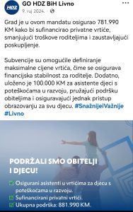 Podsjetimo, HDZ BiH Livno je na svojoj službenoj Facebook stranici 9. rujna 2024. godine objavio iznos sredstava korišten za sufinanciranje privatnih vrtića, a ujedno su naveli da su oni zaustavili poskupljenje tih usluga. Nakon izbora Gradska uprava i ustanove pod njezinom kontrolom pokušavaju nešto drugo.